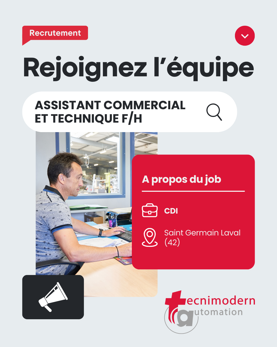 Basée à Saint Germain Laval (42), TECNIMODERN AUTOMATION recherche un Assistant(e) Commerciale(e) et technique (H/F).